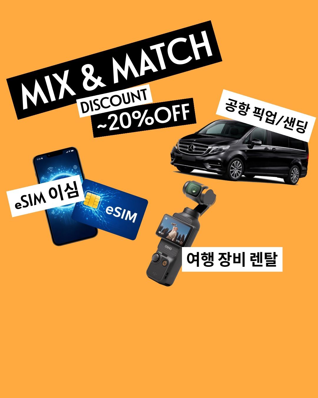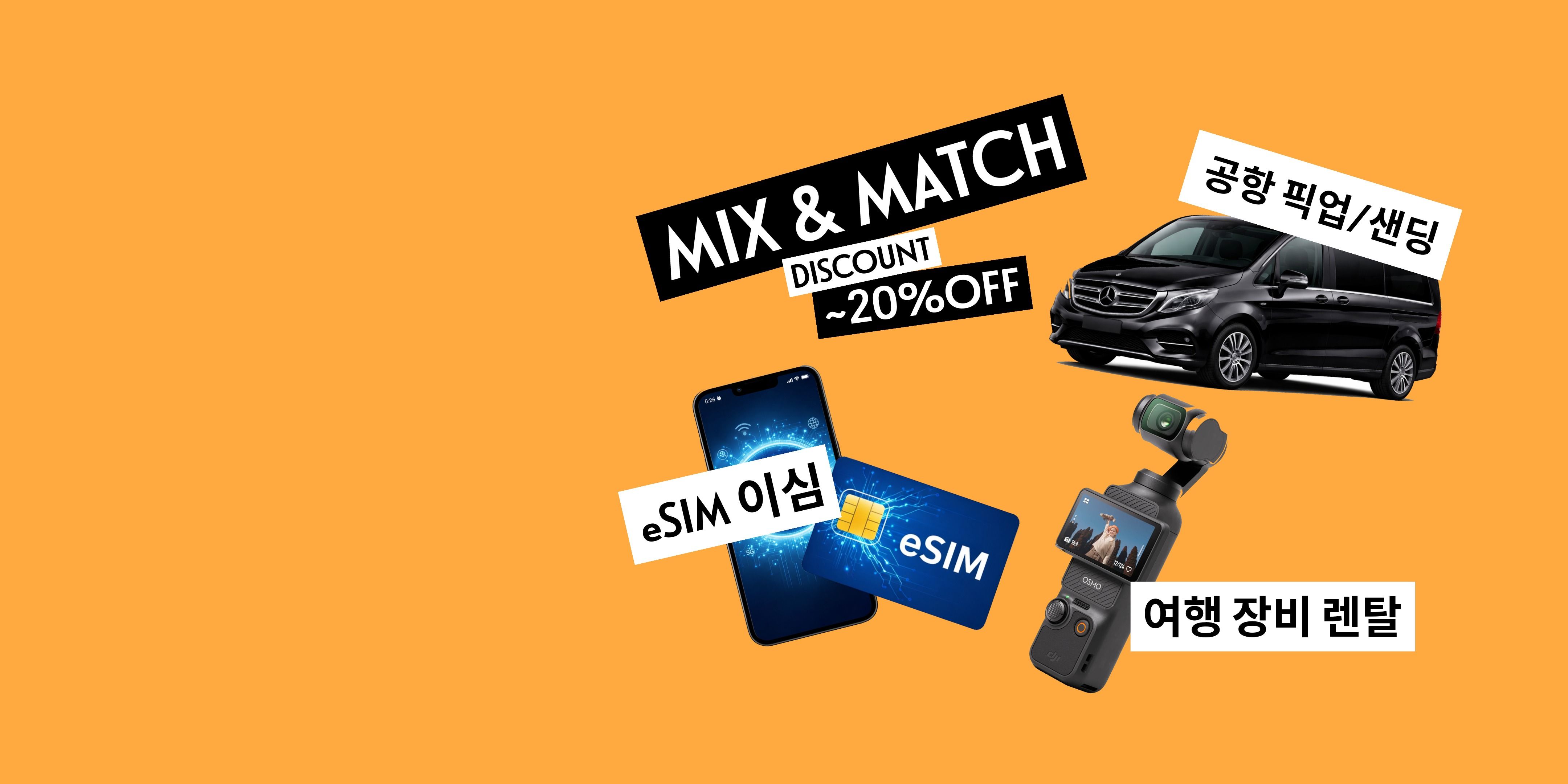 공항 이동부터 eSIM, 렌탈까지 편하게 한 번에. 함께 예약하면 믹스앤매치 할인 최대 20%
